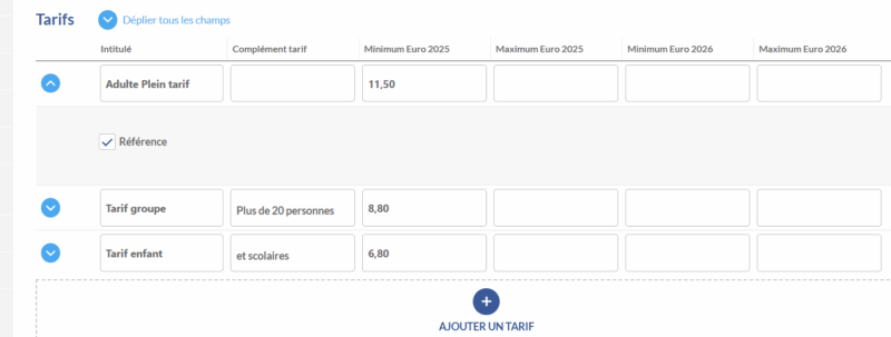 Pour chaque prestation décrite dans la base de données touristique régionale, il existe une liste de tarifs adaptés, avec un minimum et un maximum à renseigner.